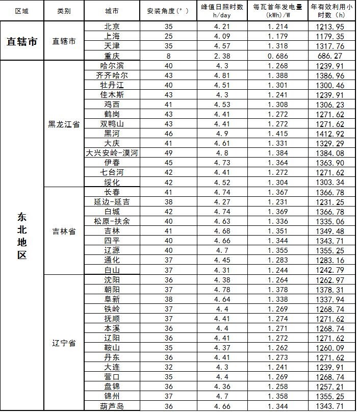 中國部分省市光伏電站最佳安裝傾角及發(fā)電量速查表(光伏從業(yè)者必備)